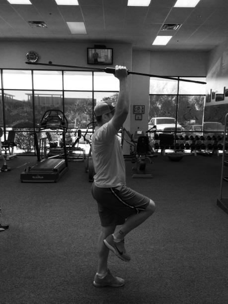 Single leg Pipe overhead, front and side: Using a ¾” PVC pipe approx. 4’ in length with 1lbs weights taped to ends or a body blade stand on right leg on mat grip pipe in middle hold directly overhead as if you were doing an overhead dumbbell press in neutral grip quickly pump your fist up and down aprox 4” for 20 reps now repeat with pipe held directly in front of you and lastly with pipe held out to side. Now switch legs and switch arms repeat