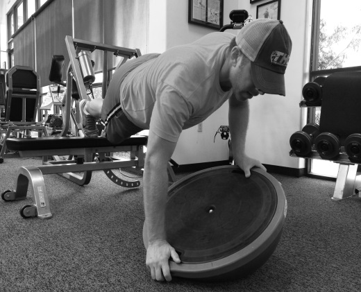 Bosu Wobbles: Put feet up on a bench, grasping both side of the inverted Bosu ball touch right fist to floor then left fist to floor back to center and do a push up. The next rep start left fist to floor than right fist back to center then push up. Go to failure if you can’t get 20 (work your way up to 20 reps…)